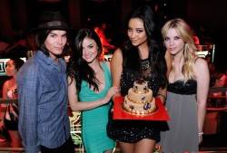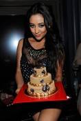 Also celebrating a birthday at Chateau Nightclub & Gardens was Shay Mitchell, accompanied by co-stars Lucy Hale, Ashley Benson and Tyler Blackburn, stars of ABC Family hit television show Pretty Little Liars. The girls were dressed to the nines with Mitchell in a black sparkly Jeremy Scott dress, Hale in a form-fitting Herve Leger green dress and Benson in a black and gray flirty ASOS dress.