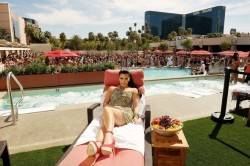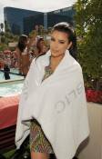After arriving inside her exclusive bungalow, Kardashian started to unwind and relax as she picked up and played around with one of the beach balls and even served it to the crowd. With a temperature of 90 degrees and rising in Las Vegas, the reality TV darling cooled off by dipping her feet in one of the VIP pools. After drying off, she wrapped a towel over her dress as she jokingly said, “It kind of looks like I’m wearing a bathing suit now.”