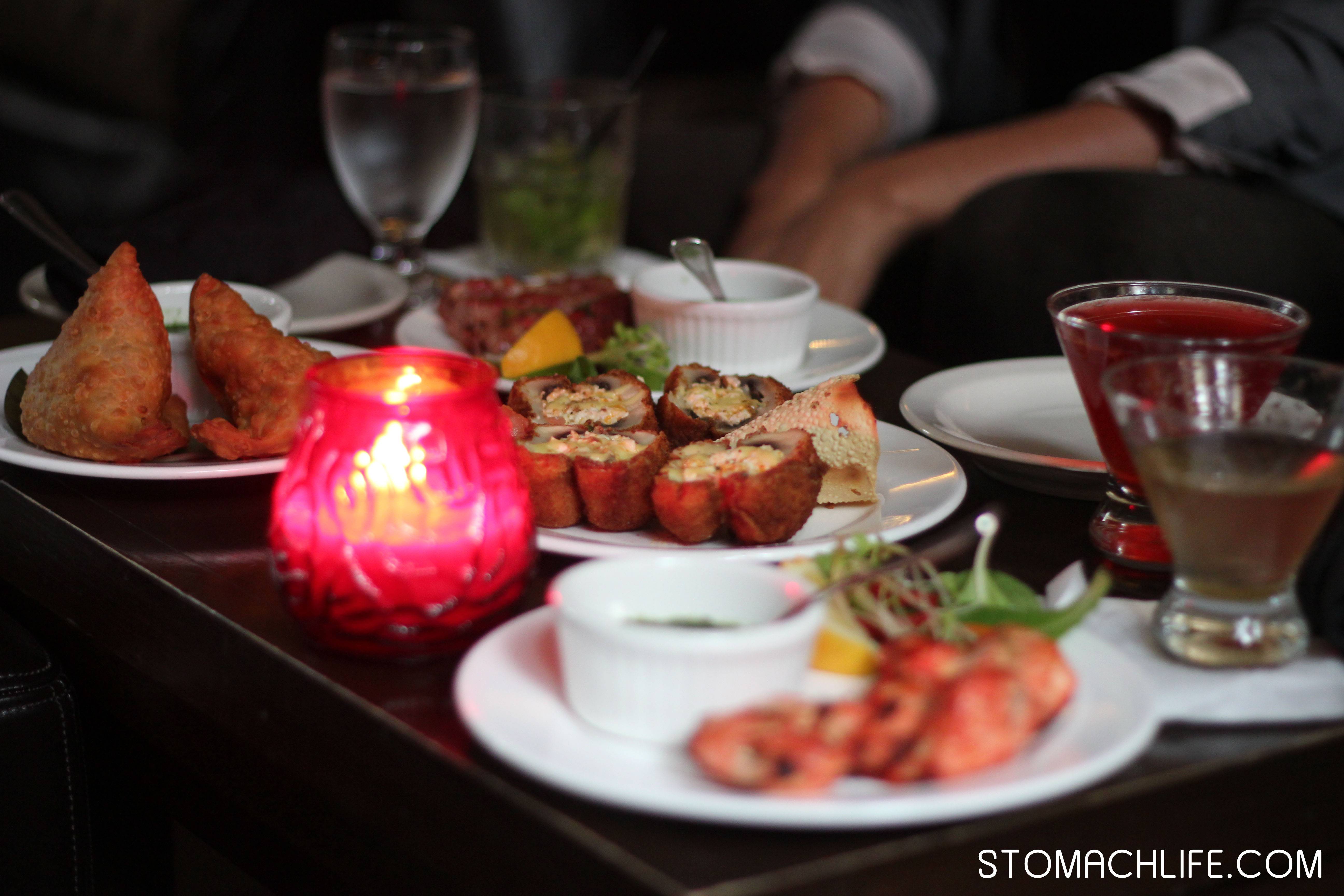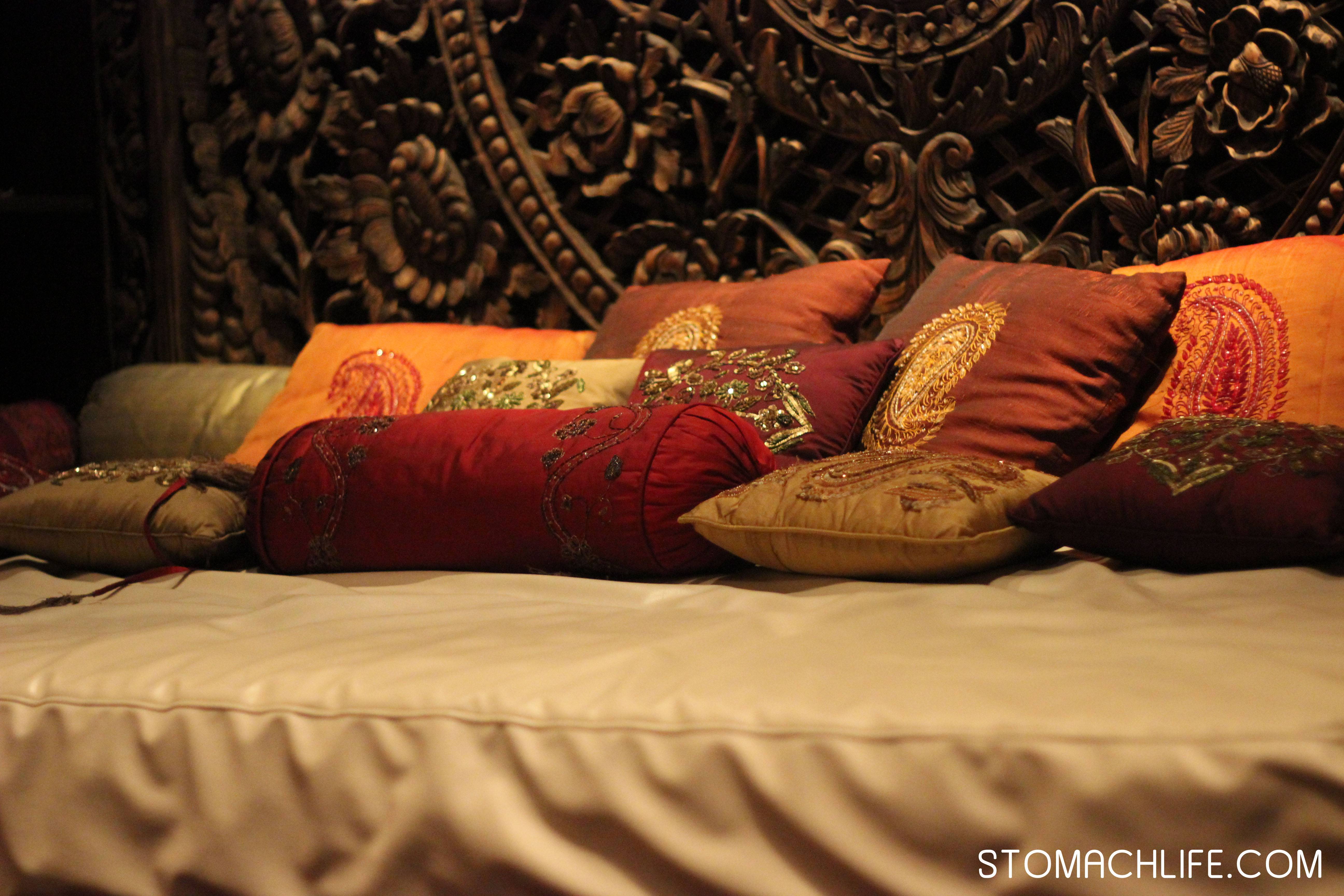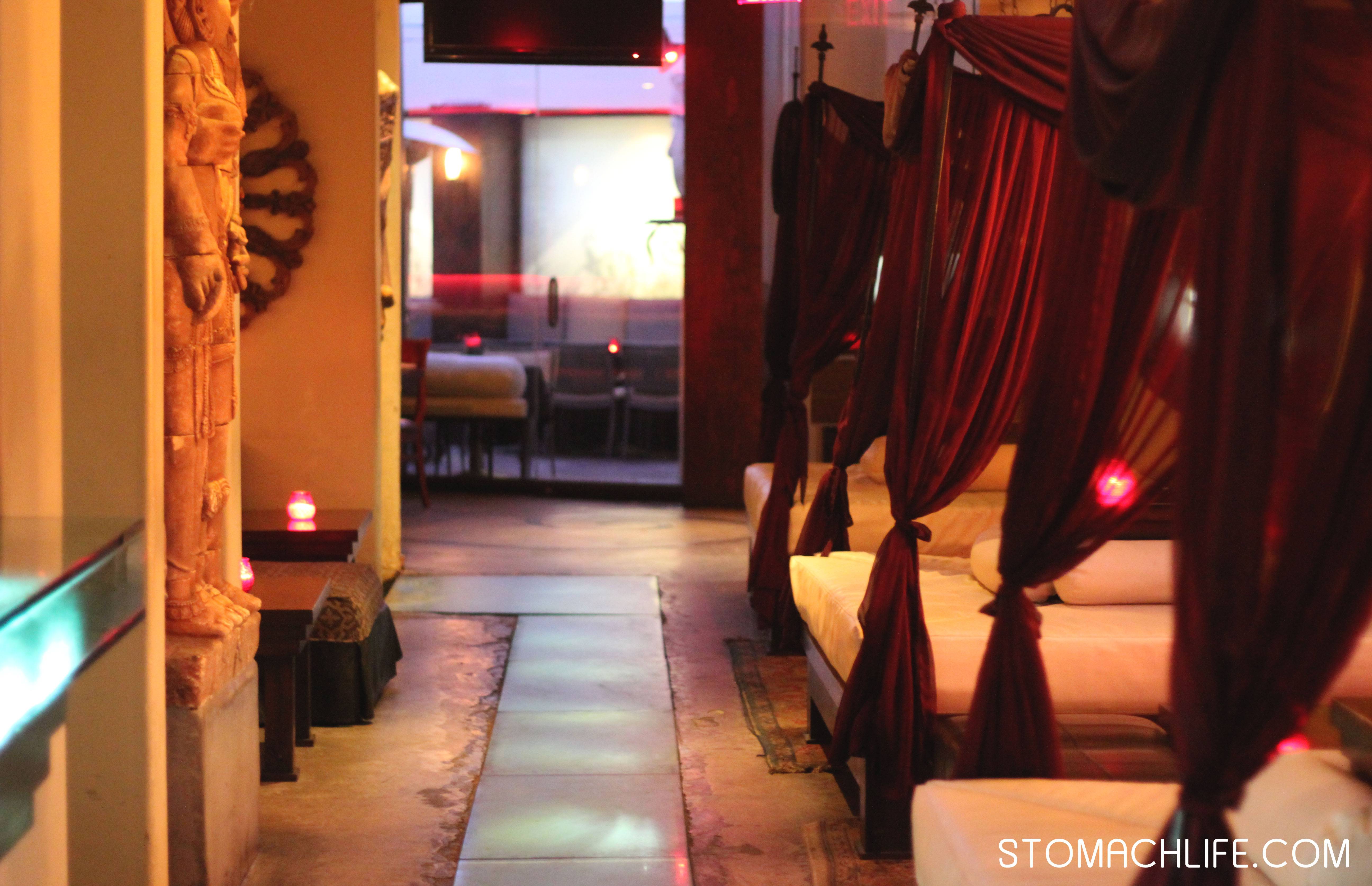 But what is new is that this exceptional Bliss Hour has recently arrived on Sunday evenings. And interestingly, the scene is drastically different from Friday or Saturday nights when diners pack the front dining area and outdoor patio, and languidly recline on the white sofa beds. At least for now, Sundays are tranquilly quiet and intimate, giving the impression that you’ve stepped into your own private, relaxing Indian oasis. The serene calmness of this restaurant-lounge allows you to truly take in all of the innate details, like the waterfall that quietly drops into the stream that’s embedded into the floor, or the subtle references to the ancient practice of Karma Sutra found in the statues, sculptures and paintings scattered throughout the space.