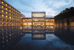 The Oberoi Group, a luxury hospitality firm, has found a way to make the concept of a business hotel, the size of a small city, seem anything but daunting. Once you enter the capacious ‘Jewel Box’ lobby, bearing soaring glass walls and brilliant pilasters of steel across nine acres of breathtaking landscape overlooking a 36,000-square-foot reflecting pool, you’ll forget about the mini-urban metropolis it appears to be.