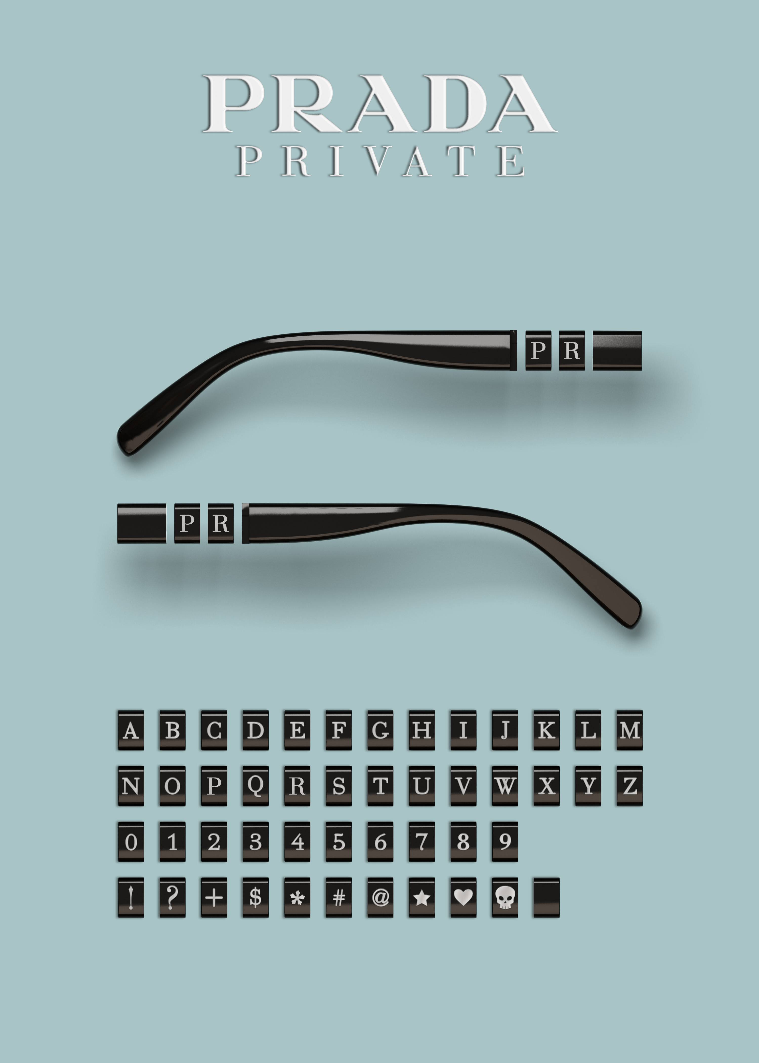 The PradaPrivate glasses include removable arms that can be personalized in many ways, including plugging in two symbol inserts in each arm of the frame, varying from your initials to symbol-based inscriptions.