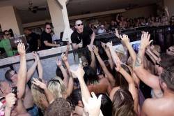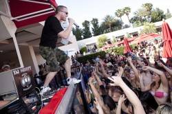 Posner put on a full performance for his fans at the dayclub. At one point during his set, the Detroit native was handed a Redwings baseball cap from a fan that he willingly wore for most of his performance. With a confident stage presence, he easily convinced the Sin City party-goers to snap their fingers in synchronization, wave their arms and bounce up and down all together. Other great moments included when the fearless performer climbed on top of the DJ booth while singing the flirty tune “Bow Chicka Wow Wow” and then finishing by jumping into the crowd. After a sizzling set, and with the desert temperature rising, the humble artist couldn’t resist jumping into Wet Republic’s 3,500-square-foot saltwater pool. He spent the remainder of the day in there mingling and taking photos with his fans.