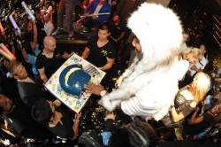 As the night moved into the early hours of the morning, the XS team surprised Phillips with an enormous cake shaped like his football helmet, surrounded by numerous bottles of Armand de Brignac “Ace of Spades” champagne as confetti dropped from the ceiling. It didn’t take long for him to dive in and take a huge bite before planting one of the bottles in the center and starting a cake fight with friends. The crowd went crazy as ponchos were passed out on the dance floor, with Phillips taking center stage under a red umbrella as Delgado led a shower of Champagne throughout the club.