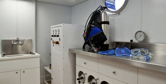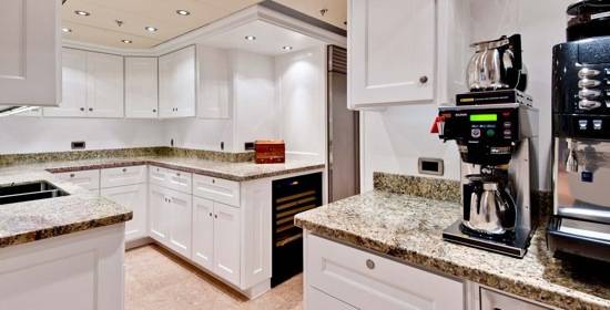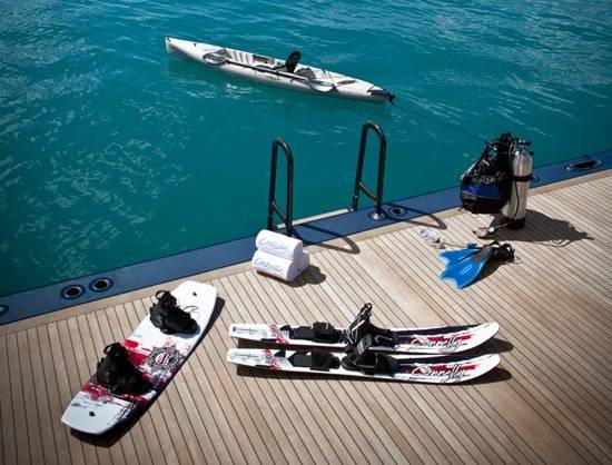 For unparalleled playtime, there is also an extensive collection of watersports equipment – four WaveRunners, complete scuba and snorkeling gear, two Seabob water scooters, beach party equipment, custom mountain bikes, sea kayaks, water skis, wakeboards, and more – which are all stowed carefully in a dedicated climate-controlled storage garage that boasts large shell doors that open to both port and starboard for optimum ease of use. The ship is even qualifies as a certified Jet Ski training center, for rusty or inexperienced guests, making the Cakewalk an absolutely astounding piece of luxury maritime real estate.