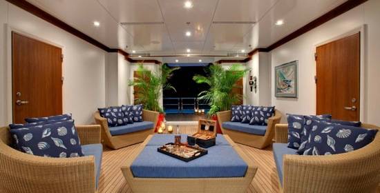 The owner accommodations boast a private deck with a full beam master stateroom, study and lounge area, a gymnasium, day spa, and spacious his/hers bathrooms outfitted with exquisite marbles. The foyer of the area leads into a large saloon with a complete bar area, leisure lounge, and theatre area.