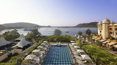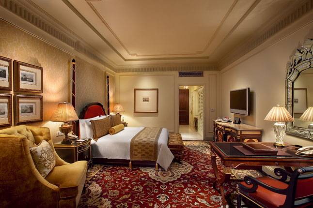 Traditional colonial furnishings, exotic passementerie, gleaming Murano chandeliers, Turkish hand-woven carpets, a $5 million collection of traditional and contemporary Indian art, lush landscape with reflecting pools evocative of Mughal style and worthy of the Taj Mahal, all exudes the grandeur of India’s most expensive hotel.