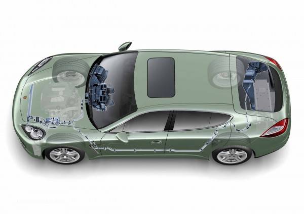The Audi sourced, supercharged, 3-liter V6 compressor engine in the Panamera S Hybrid produces 333 horsepower and commingles with the 3-phase 47 horsepower (34 kW) electric motor for a total output of 380 horsepower. Together, they ride and feel like a conventional V8. The electric motor can drive the vehicle on its own, support the gas engine or can be used as a generator or a starter. A 288-volt nickel metal hydride battery is mounted in the rear below the luggage compartment and does not compromise any typical Panamera hallmarks.