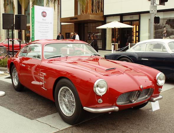 And speaking of Sydorick, I’m not sure there’s a Los Angeles collector whose cars I envy more. Routinely displaying uber-rare Italian coachbuilt postwar cars (I’ve featured his outstanding Aston Martin DB4GT Zagato here at least once), Sydorick also graced Rodeo Drive with two other Zagato-bodied cars, a 1956 Maserati A6/G2000 and a particularly unusual 1956 Ferrari 250 GT (below, respectively).