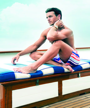 Striped swim trunks, $200, available at Vilebrequin, Beverly Hills, 310-205-9087; Ulysse Nardin Maxi Diver in 18k rose gold, $38,500, www.ulysse-nardin.com.
