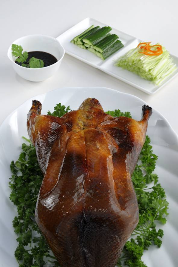 We began our meal with refreshing non-alcoholic cocktail drinks of mint lemonade and tangy lychee lemonade accompanied by delightful steaming crystal prawn dumplings, crispy wasabi prawns, and vegetarian dumplings. Known for its Pecking Duck with Chinese pancakes, we watched in awe as our waiter rolled over a beautifully carved duck and began to cut precise strips for us to fill into our pancakes.