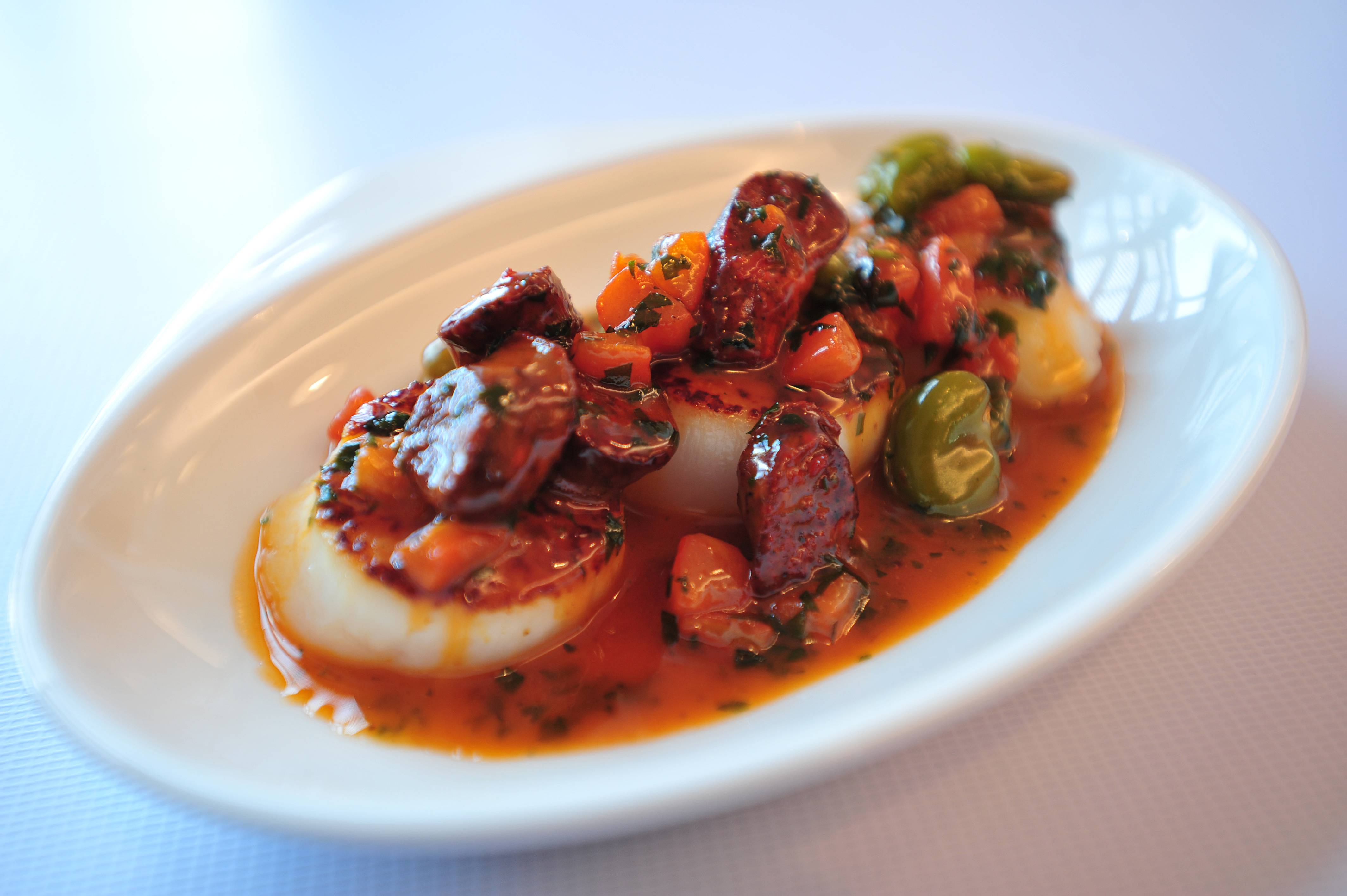We started our meal with a succulent Severn and Wye Scottish smoked salmon and pan seared scallops with cauliflower and sauce Jacqueline accompanied by a rich and fruity 2010 Carmen Cabernet Sauvignon from Chile. For the main course we ordered a grilled sea bass with a rich and creamy brown shrimp butter sauce, a beef fillet and green beans and sugar snap peas served on the side.