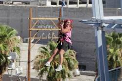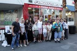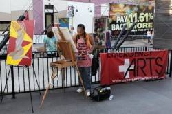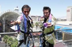 Yesterday, donned in scarves made by Opportunity Village, the “Official Elvis of Las Vegas” Jesse Garon and MobileMinister.com Elvis Roland August kicked off the For the Love of Art fund-raiser at Fremont Street Experience put on by Flightlinez zipline ride and benefitting Opportunity Village. The event featured the beautiful scarves made by Opportunity Village along with baked goods from their culinary program. Emergency Arts also provided artwork for sale and had demonstrations by live artists throughout the day.