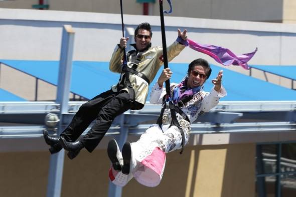 Yesterday, donned in scarves made by Opportunity Village, the “Official Elvis of Las Vegas” Jesse Garon and MobileMinister.com Elvis Roland August kicked off the For the Love of Art fund-raiser at Fremont Street Experience put on by Flightlinez zipline ride and benefitting Opportunity Village. The event featured the beautiful scarves made by Opportunity Village along with baked goods from their culinary program. Emergency Arts also provided artwork for sale and had demonstrations by live artists throughout the day.