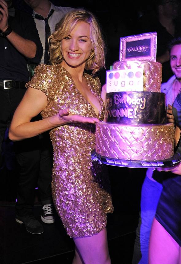 Yvonne Strahovski with her birthday cake from Gallery Nightclub in Las Vegas.