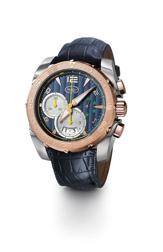 Ronaldo’s Pershing Chronograph is a striking two-tone piece of steel and rose gold, and features the symbolic blue color on the dial, which is embellished with a Côtes de Genève guilloche pattern. Five green stars, which represent Brazil’s five World Cup wins, have replaced the small seconds indexes, and the hour and minute chronograph counters are accented with green numerals and yellow gold hands.