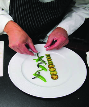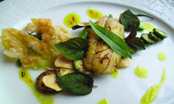 When creating dishes, I don’t like to limit myself to certain ingredients. I use only what’s fresh and what feels right at the time. At The Dining Room, I focus on creating menus with flavors and ingredients that are in season. Right now I’m working a lot with sugar snap peas, green beans, purple beans, sweet corn, different types of peppers and summer squash. I grow a lot of the produce and herbs we use in my own garden at home, so what I use is always fresh and in season. We’re also using a lot of stone fruit right now, and within a few weeks we’ll have a lot of tomatoes and eggplant. One of our current specialty items that I like working with is the Aiyu, a river fish we import from Japan.
