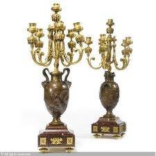 Interior Decorating will hardly ever reach the depths of design decadence exhibited in this time period. These tall, ornate, gold and bronze pieces are decorated with classical maidens above a marble base. Estimated Value: $6000