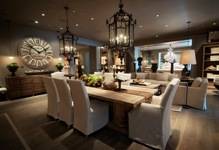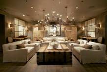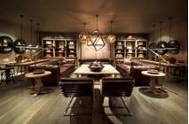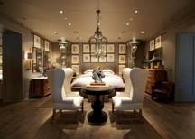 12-foot-high gates mark the entrance to the 4,000-square-foot European garden courtyard that surrounds the gallery, which is bordered by a fresh floral boutique by renowned Los Angeles floral designer, Eddie Zaratsian. In the main gallery, guests enter an international bibliotheque where vintage maps from iconic cities from around the world are integrated with corresponding design magazines and books representing Restoration Hardware’s global design influence. The dramatic lobby, punctuated by America’s first organic tea atelier by Bellocq, has soaring 22-foot ceilings, walls of charcoal Belgian linen, and an installation of vintage birdcages reimagined as giant crystal chandeliers suspended from heavy rope. A classical arrangement of rooms punctuated by monumental fireplaces, salvaged architectural pieces, industrial antiques, and select items from Restoration’s fall 2011 collections can be found throughout the two floors beyond.