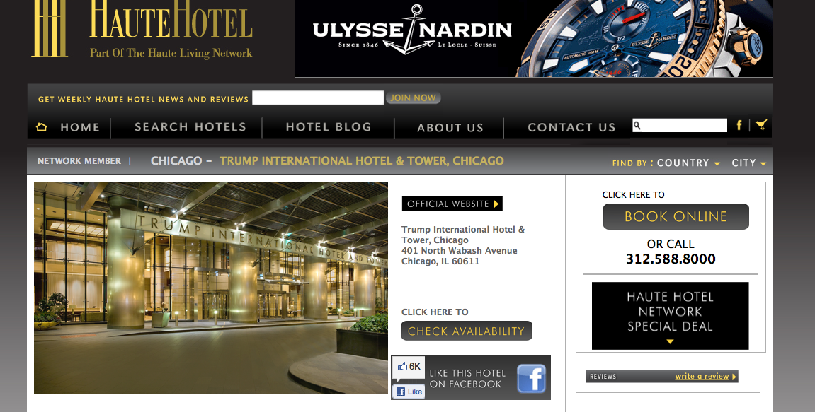 Going to Chicago? Make sure you check out The Trump International Hotel & Tower® , an exclusive member of The Haute Hotel Network. The elegant hotel rooms start at a spacious 600 square feet and showcase panoramic views of the Chicago skyline, Lake Michigan and Chicago River. Dine in style at Sixteen, a contemporary, Michelin-rated restaurant featuring gourmet Modern-American or relax over a signature cocktail and neo-Japanese fare at the hotel’s chic and sophisticated lounge, Rebar. If it is a calm you seek, the Spa at Trump®, a 23,000 square foot oasis, invites you to relax and rejuvenate. Visit The Haute Hotel Network for more information on the The Trump International Hotel & Tower® and our other exclusive members worldwide.