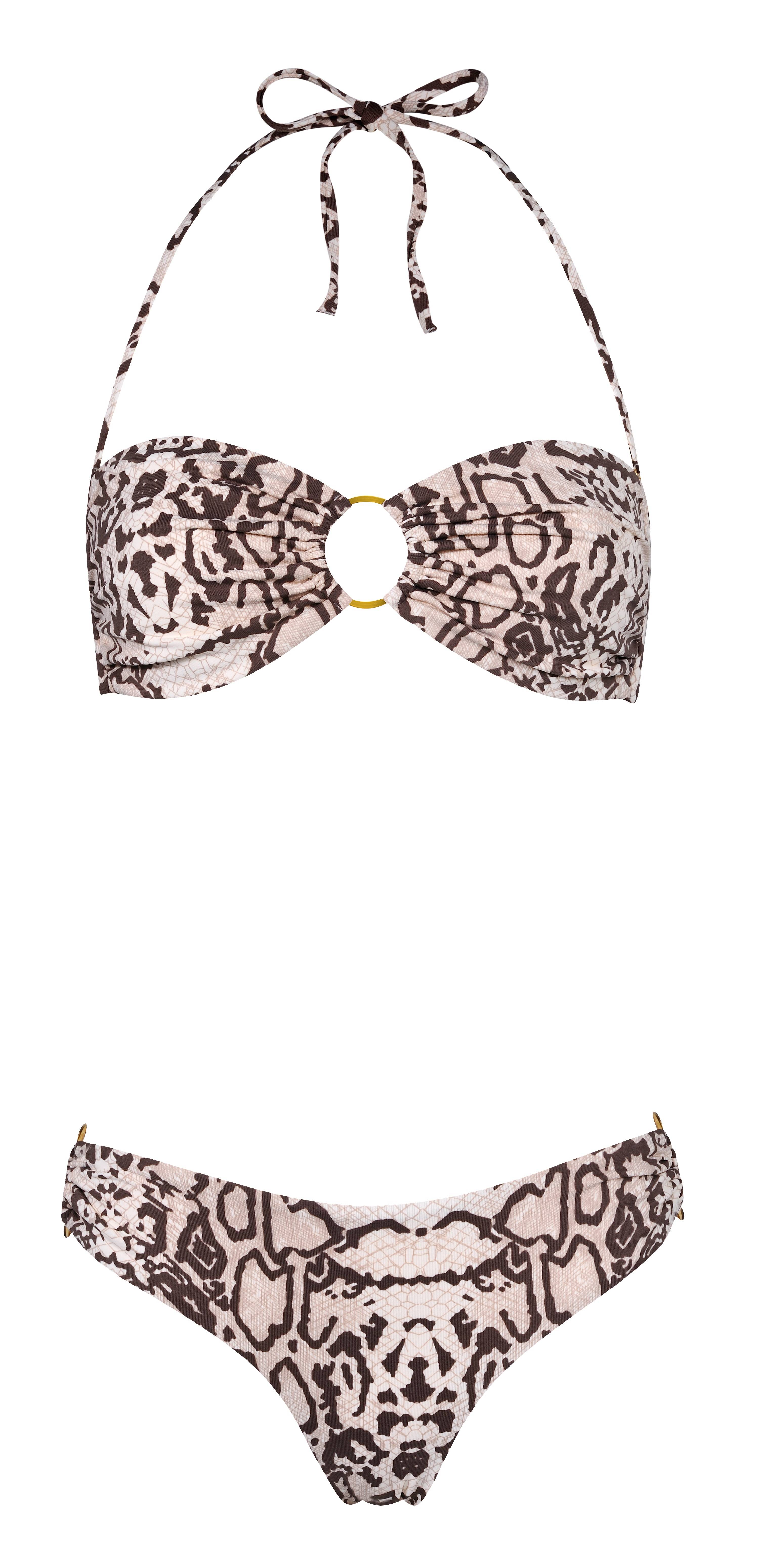 Meant to portray the glamour that has come to be associated with the W South Beach, Odabash’s two-piece creation features a graphic print of the python variety and is accented with gold hardware for extra elegance. The cut—a bandeau top with removable straps and dip-front bottom—is traditionally flattering.