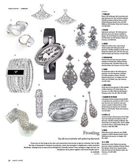 Take a look at the Délices de Cartier watch, complete with rhodium-plated white gold and diamonds, in this issue of Haute Living San Francisco. The icy timepiece is part of a jewelry trend report on diamonds, the best kind of frosting. Take a look at the whole report to see other options of dazzling jewelry.