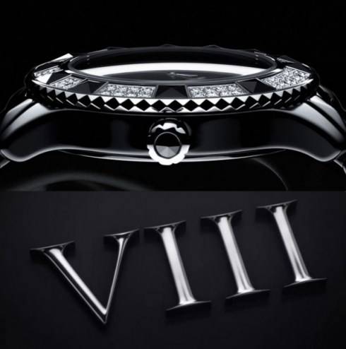 Dior VIII, pronounced with the French term huit for the Roman numeral, is divided into three tiers which Dior professionals relate to the three kinds of essential dresses a woman should have in her closet. Each watch has a black face and a ceramic bracelet with pyramid-shaped links. A core selection of eight day wear timepieces feature black lacquer dials, a signature VIII which marks 8 o’clock, and the bezels which are punctuated in a spiraling pattern with a few diamonds.