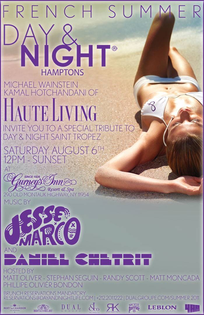Day & Night, the hottest summer party, returns to the Hamptons. Hosted by no other than Kamal Hotchandani of Haute Living Magazine and Michael Wainstein, the French Summer themed Day & Night Party will be the event of the season, and you won’t want to miss it. Guaranteed bottles popping and champagne spraying are just the beginnings of the glitzy and glamorous day party. As tribute to Day & Night Saint Tropez, you can guarantee bikini-clad bronzed goddesses and the ultimate crowd of power players.