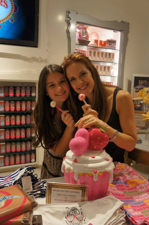 Kelly Preston and daughter Ella Bleu stopped in to Sugar Factory American Brasserie at Paris Las Vegas late last night with a couple of friends. Preston and her 11-year-old daughter were in a wonderful mood as they shopped around the massive flagship store, picking out items such as Sugar Factory loungewear and apparel, a pair of Sugar Factory’s designer denim jeans, three Couture Pops including a Hawaiian Crush Couture Pop from Nicole Scherzinger’s line of the famed Sugar Factory signature treats and a large cupcake-shaped coin bank.
