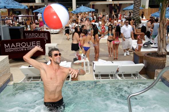 Olympic swimmer Michael Phelps spent his Saturday at a pool, but not swimming laps. He partied at Marquee Dayclub at the Cosmopolitan of Las Vegas taking in the sounds of DJs Matt Darey and Larry Tee. Phelps drank tequila and ate a Kobe burger at the hot spot.