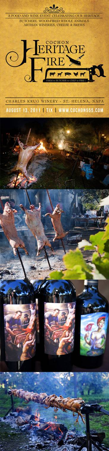 Are you a lover of Heritage meat roasting over open flames? This weekend, Cochon will bring a feast to Charles Krug Winery to celebrate of the art of butchery and fire roasting. This extravagant event will include 25 guest chefs, 10 all-star butchers, 2,000 lbs. of heritage meat, and enough microbrews and wine to wash it all down.