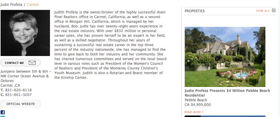 If you’re interested in luxury real estate in California, check out Judie Profeta, Carmel, California’s premier expert in residential real estate and an exclusive member of the Haute Living Real Estate Network. Judith Profeta is the owner/broker of the highly successful Alain Pinel Realtors office in Carmel, California, as well as a second office in Morgan Hill, California, which is managed by her husband, Bob. Judie has over twenty-eight years experience in the real estate industry. With over $832 million in personal career sales, she has proven herself to be an expert in her field, as well as a skilled negotiator. Check out Judie Profeta and our other exclusive members in The Haute Living Real Estate Network worldwide.