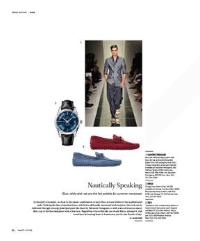 “In the sprit of summer, we look to the classic combination of navy blue, red and white for the sophisticated male. Evoking the idea of nautical dress, which is traditionally associated with summer, the look can be delivered through a strong pinstriped pant like these by Salvatore Ferragamo or with a less obvious accessory like a top of the line timepiece with a blue face.”