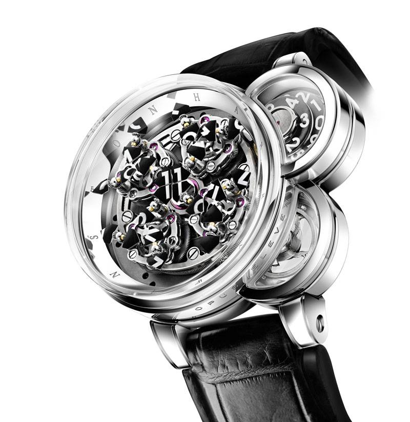 The mechanics necessary for this display of horological fireworks are infernally complex. 566 components, running in a staggering total of 155 jeweled bearings (an ordinary mechanical watch has 17 jewels) are necessary to present this completely unique mechanical spectacle. The Opus XI is limited to 111 pieces.