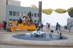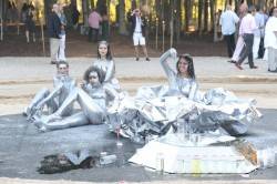 The six acre grounds of the Watermill Center were covered with performance artists and art installations from artists from over 30 countries. After walking up a mirrored staircase, the guests were greeted by by hair master, Charlie Le Mindu’s, three giggling performers in the stone floored entrance chamber. A steam roller turned into a giant music box circled performers in a nest of silver foil covered in glitter. A huge paper spinal column with a balloon brain floating at the top circled through the party guests. The massive collection of art and unique performances happens only one night for the benefit making the event one of the most sought after party tickets of the summer.