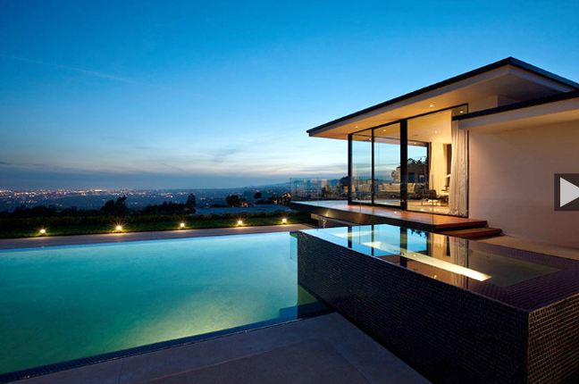 The designer’s new home is a midcentury-modern mansion that was completely renovated and includes four bedrooms, a home theater, a pool, a spa and stunning walls of glass.