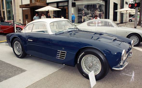 Many of Sydorick’s exquisite and unusually rare automobiles, which are predominantly postwar coachbuilt Italian sports cars, have been featured in this blog before. The show winning 250 GT, also displayed at last June’s Rodeo Drive Concours (below), is one of only three such cars to wear coachbuilder Zagato’s individually styled bodies, complete with trademark double-bubble roof.