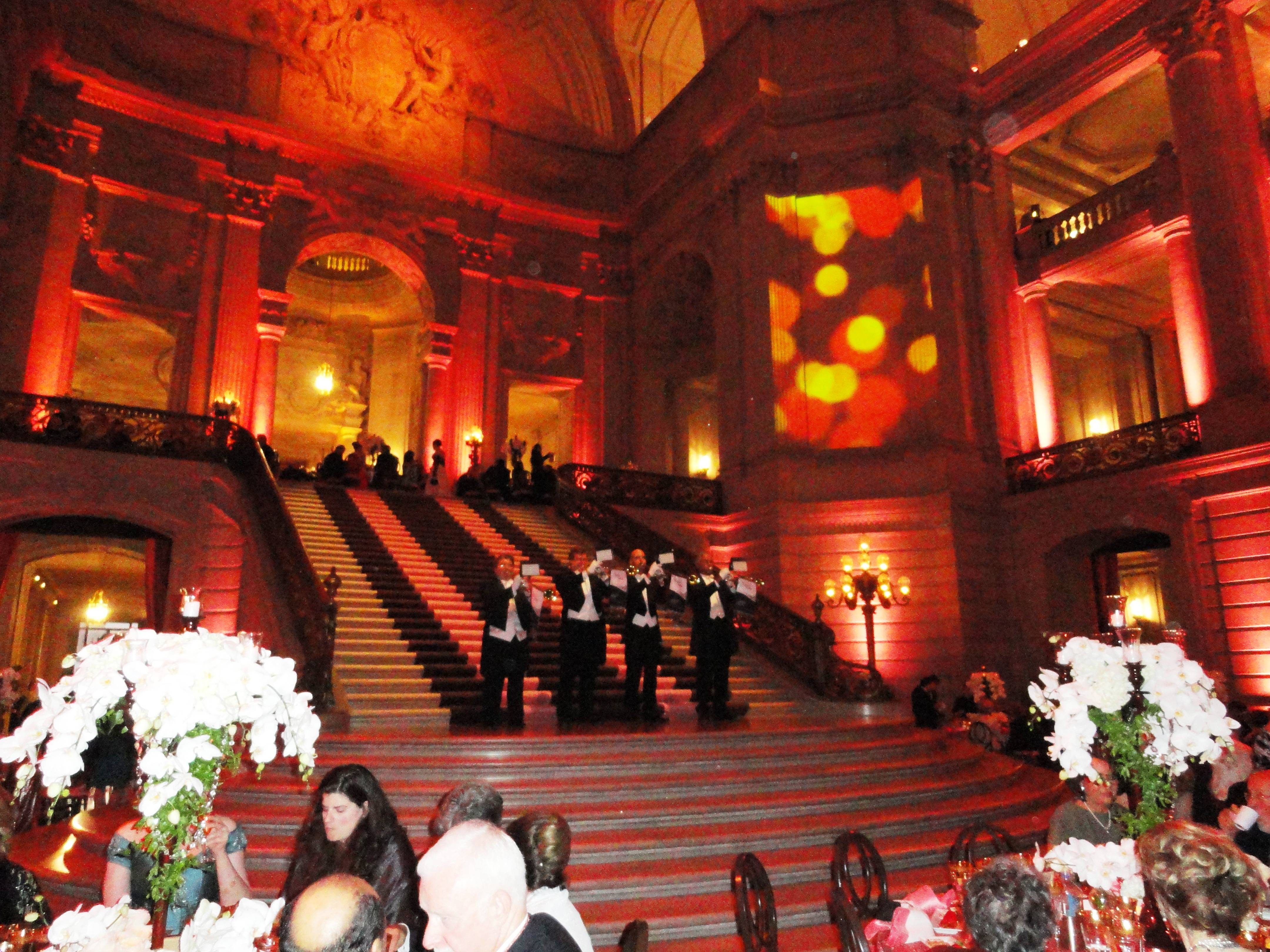 The magical evening began with a gala reception at the War Memorial Opera House, followed by a fabulous dinner at City Hall Rotunda and Patron Tent prior to the concert at Louis Davies Symphony Hall. After the concert was the After-Party at the tent and Grove Street, featuring the band Notorious. A street restaurant was created with pizza ovens, BBQ grills, tables and heating lamps. Guests were glad the cool San Francisco weather was cooperating; it was in fact warm enough for the ladies in their gowns and Manolo sandals to party on the street at midnight. Even after Notorious’ last song at 12:30 a.m., hundreds of guests still lingered around the dance floor.
