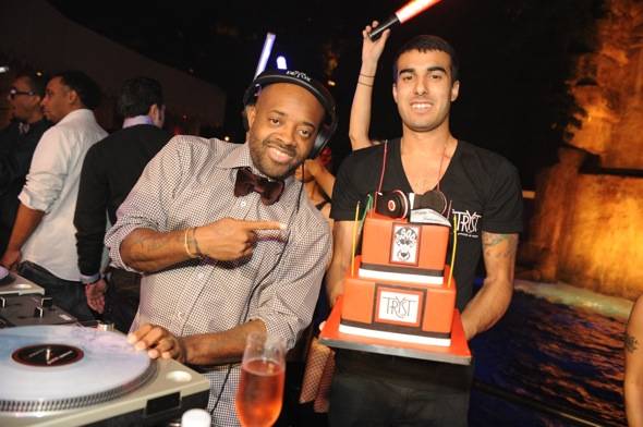 Last night, Tryst Nightclub at Wynn Las Vegas celebrated resident DJ Jermaine Dupri’s 39th birthday alongside thousands of fans. Dupri headlined the deejay booth donned in the perfect birthday attire sporting a warm brown plaid shirt and velvet bowtie as he mixed tracks on the fly for dancing belles and beaus.