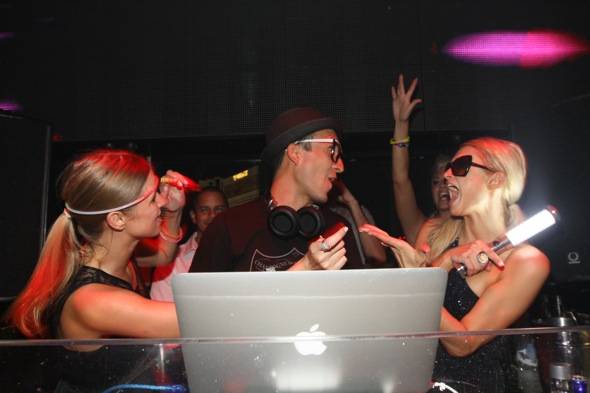 Saturday night, LMFAO and DJ Vice rocked the crowd at Tao Nightclub while Z-Trip held court at Lavo at the Palazzo. Redfoo, SkyBlu and the 30 person strong Party Rock crew performed at TAO for the packed club with favorites including “I’m in Las Vegas B***ch” and the “Party Rock Anthem.” They sprayed the crowd with Champagne and shots. Taking in the scene from a table on the dance floor were Paris and Nicky Hilton and LMFAO made sure to give them shout outs during their show. SkyBlu led the entire club in singing “Happy Birthday” to Redfoo in celebration of his 36th birthday and the birthday boy was surprised with a four-tiered cake from Gimme Some Sugar. Redfoo immediately sampled the creation and the crowd erupted. Paris and Nicky joined DJ Vice in the booth for a bit and later in the night Paris and SkyBlu danced on the Tao catwalk to “Sexy and I Know It” as the crowd cheered on.