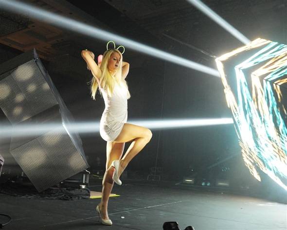 The holiday weekend celebration continued at Marquee Nightclub with DJs Blake Jarell and Armin Van Buuren. Paris and Nicky Hilton arrived at the hot spot with friends around 3 a.m. after joining thousands of party-goers at The Chelsea at the Cosmopolitan of Las Vegas for the massive Deadmau5 stage production. Served by sexy servers in the Marquee VIP area at the concert, the ladies hung out at their stage view table as Deadmau5 entertained the crowd with his electrifying stage production. At the concert, Paris even got in on the show by performing on stage dressed up as a ghost during Deadmau5’s huge hit, “Ghosts n Stuff.” She revealed herself and danced on stage in a sexy white mini-dress.