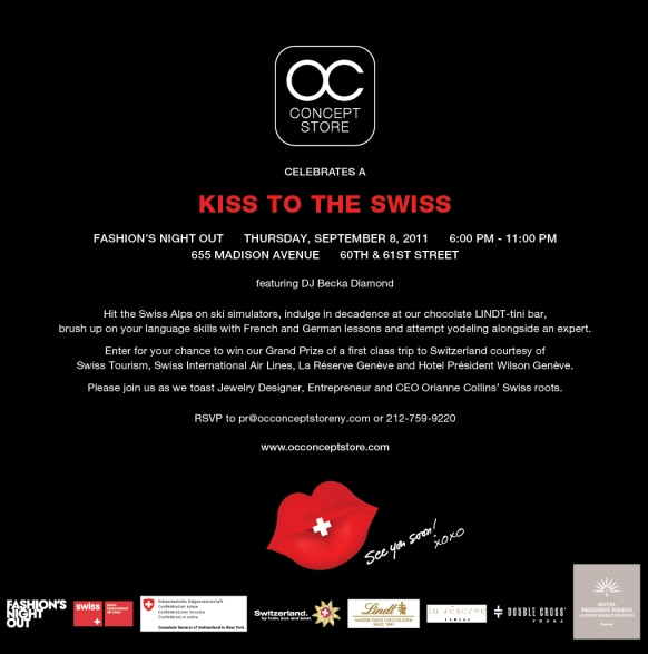 This Thursday for New York’s Fashion’s Night Out, this gallery-style boutique celebrating one of a kind rarities and the art of luxury will transform its bi-level Madison Avenue shop into destination Switzerland. But at the store’s “kiss to the Swiss” party, no passports will be necessary. OC Concept Store will allow patrons to experience the finest in Swiss culture, complete with ski simulators, a chocolate bar, yodeling competitions, and French and German lessons, all while toasting to founder, entrepreneur,and CEO Orianne Collin’s Swiss roots. While a special celebrity DJ Becka Diamond spins for the evening, take a photo against the custom designed Swiss backdrop and enter to win the grand prize of a first class trip to Switzerland, courtesy of Swiss Tourism and SWISS airlines.