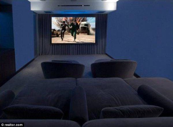 It wouldn’t be a Los Angeles mansion without a screening room, and Perry’s new home is no exception. The cozy room is furnished with plush velvet sofas that seat nine.