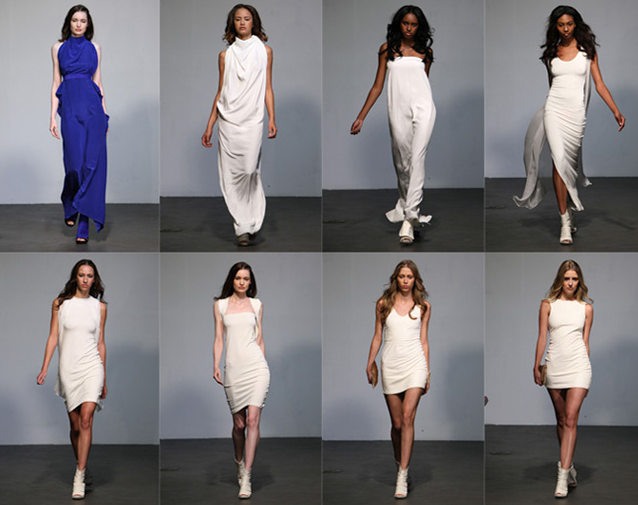 For Spring Summer 2012 Mike Vensel explores the intersection of the Egyptian goddess Isis and the architect I.M Pei. Egyptian culture, which includes architectural and geometric elements, have all been deconstructed into multiple themes that run throughout the collection, and some unexpected elements that span the most primitive origins of African culture to the most modern architectural themes found in the light, airy work of I.M. Pei. Light winged and caped silhouettes are joined by body-conscious and tunic styles.