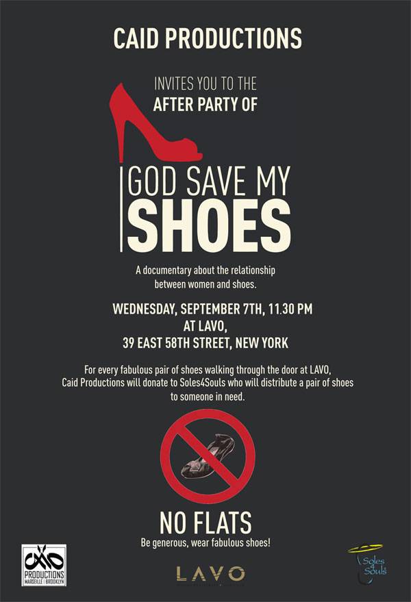 The relationship women have with their shoes is one that most men are baffled by. In an effort to explain what it is that makes us weak in the knees for a 6-inch red-soled pump, Julie Benasra wrote and directed a documentary entitled God Save My Shoes. The film will be premiering tonight, on the eve of New York Fashion Week, with an after party at exclusive nightclub LAVO. The party will act as a fundraiser, as the films production company, CAID Productions, and SOLE4SOULS have partnered to bring one pair of shoes to a person in need for every fabulous pair that walks through the door. This evening’s soiree is the perfect combination of fantastic footwear and philanthropy. Attendees must even adhere to the strict “NO FLATS!” policy.