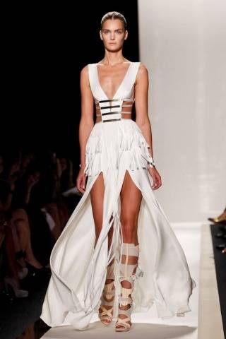 The Herve Leger Spring/Summer 2012 collection was about metallic; as well as cut outs, knee high gladiator sandals, and geometric patterns. With an assortment composed mostly of neutral colors, other features included fringed hems and harness-inspired details. Models walked the runway with sleek hair that was tied back, paired with fresh-faced natural make up. My favorite piece, a white gown with deep slits and a cut out bodice, was the stand-out look that closed the show. The list of attendees included fashion blogger Bryan Boy, Ashlee Simpson, and LeAnn Rimes. Max and Lubov Azria are the masterminds behind the famed bandage dress that has become a staple in every girl’s wardrobe.