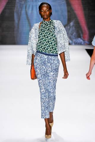 Vivienne Tam’s Spring/Summer 2012 collection was inspired by the serene Zen gardens in Asia, in addition to the glamour of the 1970s. A collective trend seen in most S/S 2012 collections, Vivienne Tam amped up her show with the use of color, and by mixing distinct but complimentary prints. The flirtatious pieces that graced the runway included some with fringed hems, billowing sleeves, and ocean-inspired hues such as cyan and coral. Front row at the show included Mercedes Benz Fashion Week creator Fern Mallis, celebrity stylist June Ambrose, and actress Beverly Mitchell.