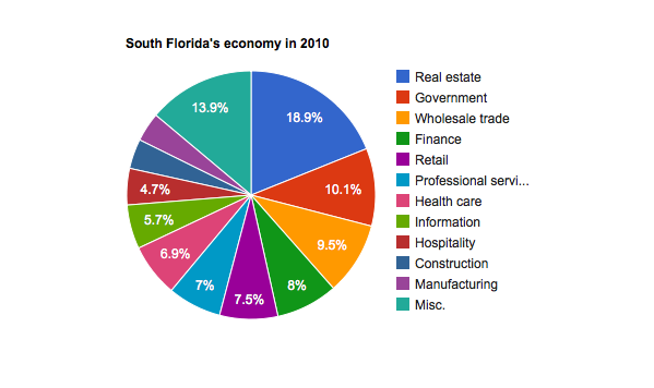 The chart above is a look at South Florida’s economy by each industry’s share of output. The proportions come from the 2010 Gross Domestic Product numbers released Tuesday by the Commerce Department. The numbers measure both wages and profits earned by businesses in the industry (money-losing businesses lower their sector’s output). This includes data from Broward, Miami-Dade and Palm Beach.