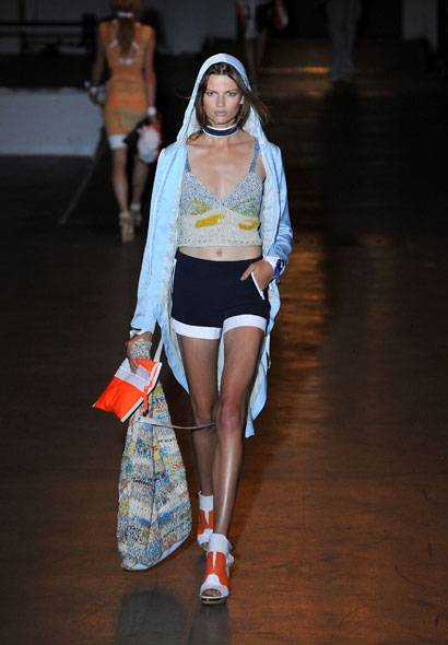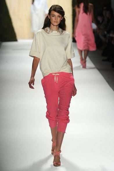Drawstring trousers, special materials usually reserved for athletic wear, cropped sport’s bra-like tops, leggings and hoodies, have all had their place on the spring runways—and there have been some winning combinations.