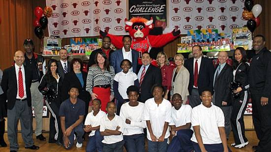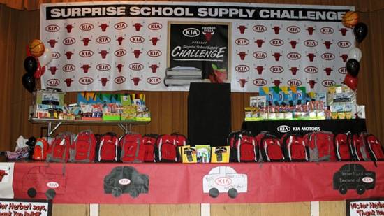 The Bulls were on hand to personally deliver the donated supplies, including spiral notebooks, pencils, pens, pocket folders, crayons, and backpacks – all in Kia vehicles – to the kids at the school.