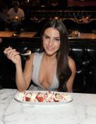Sporting a slate gray Contrarian dress and sky-high, hot pink stilettos, Lowndes indulged in a savory dinner of pacific salmon, macaroni and cheese pops, bruschetta and fettuccini alfredo. For dessert, the brunette bombshell devoured a colossal strawberry cheesecake ice cream sundae covered in whipped cream and hot fudge.